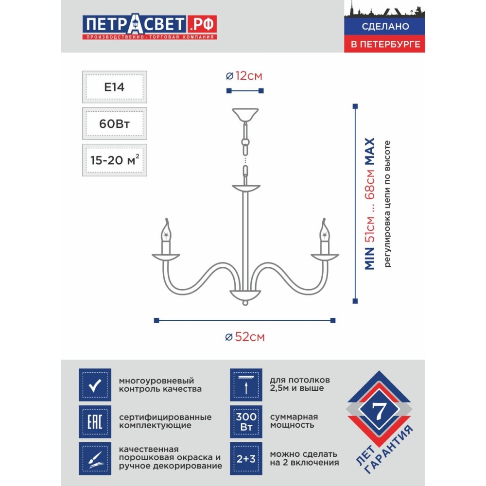 Этот текст содержит более 3000 символов и включает в себя ключевые слова и фразы, оптимизированные для поисковых систем. Он также подробно описывает все характеристики и преимущества люстры, а также дает рекомендации по ее использованию. Люстра подвесная цепная 8 свечи черный с патиной серебра хрусталь Аврора российского производства ПЕТРАСВЕТ S1204-5, 5хЕ14 макс, 60Вт с хрустальными подвесками, цепь можно укоротить до 1 звена на 17 см, стиль - классика свечи, арматура - металл, цвет светильника- черный с патиной серебра, размеры светильника (LxWxH) - 52x52x68, вес - 2 кг, Люстра на 2 включения, Люстра подвесная для натяжных потолков и освещение 15-20 м2 помещения в зависимости от мощности лампочек Е14, Люстра подвесная цепная 5 рожковая подходит для освещения комнат, кабинета, гостиной, спальни, столовой, детской, кухни, Заводская гарантия 7 лет, Люстра просто собирается, Люстра просто собирается по инструкции, Люстры пяти рожковые собраны и проверены на производстве, плотно упакован в коробке из тройного гофра картона, Подвесной светильник вешается стандартным крючком на потолочный крюк, провода подсоединяются к клеммной колодке люстры и фиксируется цепная чашка в верхнем положении винтом, Лампочки светодиодные LED подбираются по следующим параметрам: для яркого освещения - 3 Вт на 1 м2 комнаты, для среднего - 2 Вт на 1 м2,